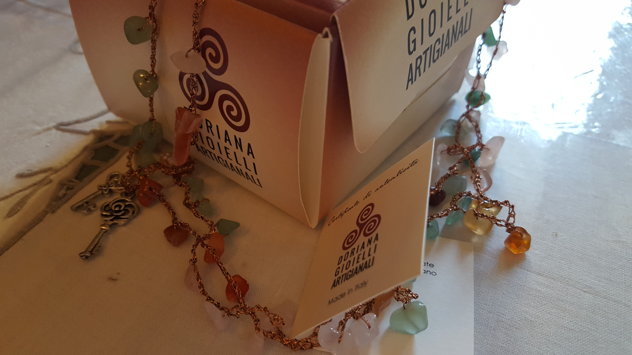 Collana in filo di lamè ramato con pietre dure di avventurina, quarzo ed agata. Tre ciondoli lucchetto e due chiavi